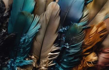 Explore the intricate details of colorful bird feathers in this close-up image. The vibrant tones and patterns create a stunning visual showcase of nature's beauty.