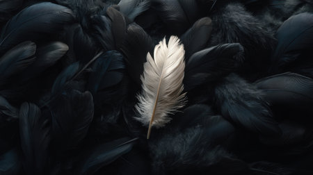 Delicate white feather rests gracefully among bed of dark black feathers, creating striking contrast that evokes sense of tranquility and elegance. soft textures and rich colors enhance visual