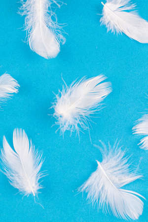 Beautiful array of delicate feathers showcasing shades of blue, white, and cream in intricate detail and soft lighting