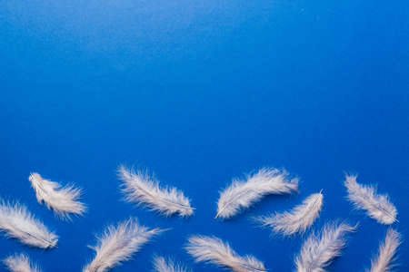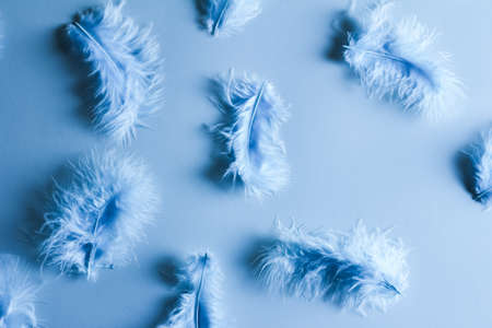 Blue feathers randomly on a blue background, flat lay, blue minimalism