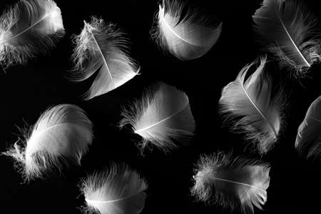 Black background with white feathers. Abstract backdrop of swan feathers. Minimal concept.