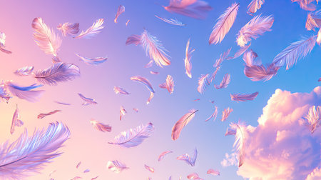 A shower of delicate, iridescent feathers falling gracefully in the morning light, set against a vivid, cloudless sky.