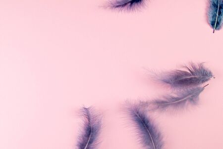 Soft, fluffy pastel color feathers on blue background. Easter or spring holiday concept. Minimalism pattern. Banner, copy space