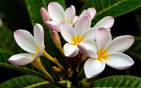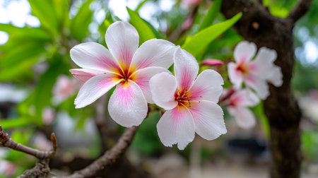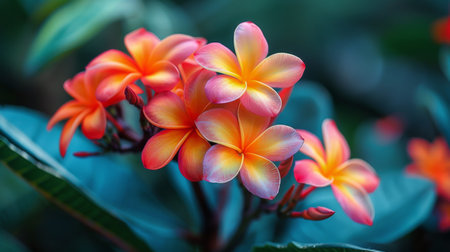 Delicate Plumeria Blossoms Displaying Vibrant Hues in a Lush Garden