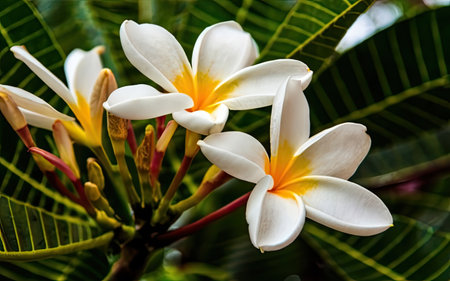 A captivating image of vibrant white and yellow plumeria flowers blooming amidst lush greenery, capturing the essence of tranquility and beauty in nature.