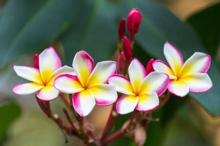 Colorful flowers in nature. Pink White and yellow frangipani flowers with leaves in background. Plumeria flower blooming and green leaf With bright sky .