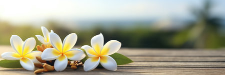 A bunch of franginani flowers sitting on top of a wooden table, sea view behind. Panoramic banner.