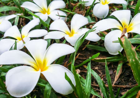 White Plumeria flowers fresh fallen on grass, Frangipani tropical flowers. Close up