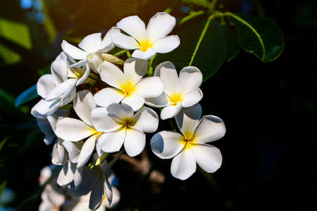 Flowers are blooming In the breeding season Has a green foliage background.white and yellow Plumeria