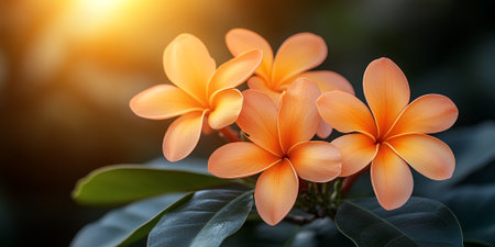 Beautiful Orange Plumeria Flowers Blooming in Sunlight A Close Up Shot of Tropical Plumeria Blossoms