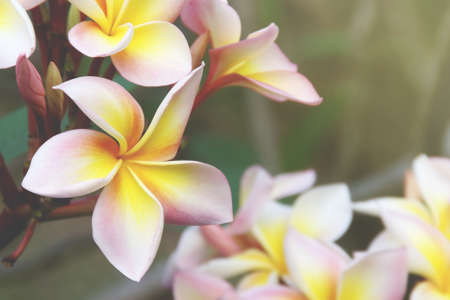 group of yellow white and pink flowers (Frangipani, Plumeria) on a sunny day with natural background in THAILAND
