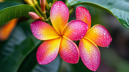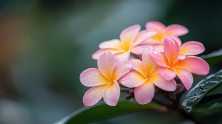 This stunning close-up showcases plumeria flowers adorned with water droplets, surrounded by rich green foliage, creating a vibrant tropical paradise, perfect for nature lovers.