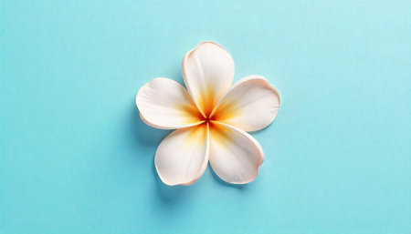 Elegant white plumeria flower on vibrant blue background