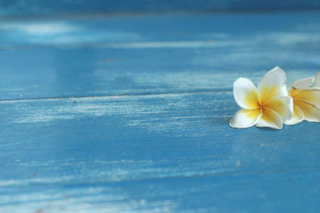 White frangipani flower on blue wooden vintage.