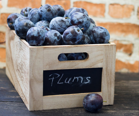 Close-up of ripe home plums on a wooden background in the garden. natural healthy vegan food