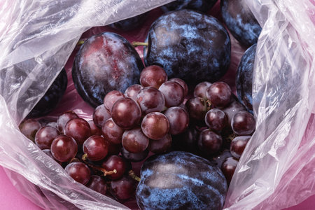 Fresh ripe plum fruits and grape berries in plastic bag package on minimal pink background, top view macro