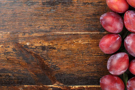 Ripe red plum on shabby wooden background. place for text.