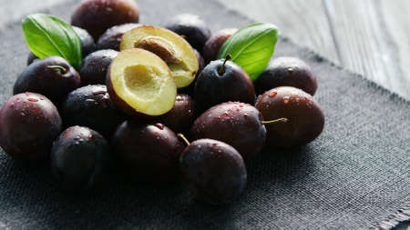 Ripe purple plum fruits on the wooden background. One plum in cut and other are whole. Fruity still life. Healthy food. Flat lay with copy space,horizontal.