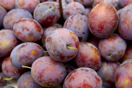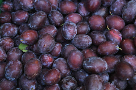 Juicy plums, fruit rich in vitamins, at a market stand presented