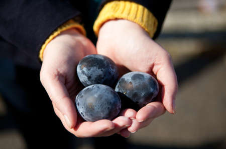 Harvesting season. The hands of a senior woman are holding large autumn plums against the background of a bowl of plums. Natural fruits from the garden