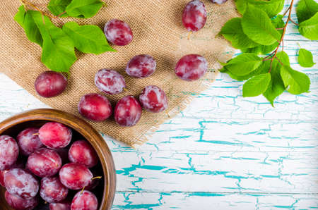 Plums in wooden bowl and burlap with green leaves on white old table