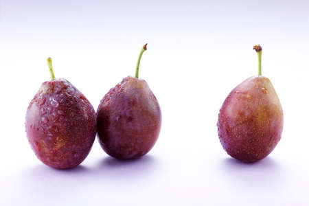 Delicious plums on a white with water drops
