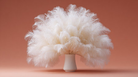 Decorative arrangement of numerous white ostrich feathers, artfully arranged in a simple white vase. The feathers fill a vase creating a visual display with a soft, light, and elegant appearance. The image depicts a high quality, smooth, and detailed rendering of a still-life scene. The overall composition is minimalist, and the soft colors and texture give it a visually calming effect. The background is a solid, muted coral color.