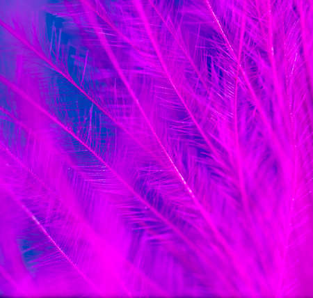 Close-up of vibrant iridescent feathers with purple and pink glow in abstract lighting.