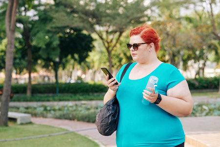 Yuong plus size woman walking in park with bottle of fresh water and checking messages and notifications in smartphone