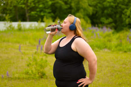 Plus size white Caucasian woman in headphones, a black T-shirt drinks water while doing sports on the nature. An active lifestyle. outdoor sports.