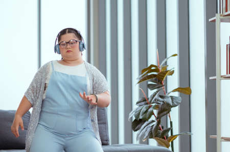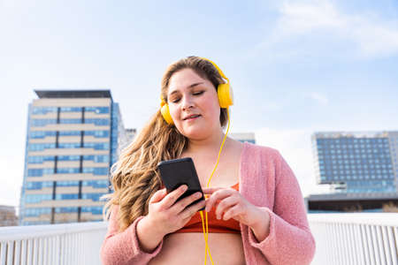 Young plus size Caucasian model listening to music with headphones from her mobile phone