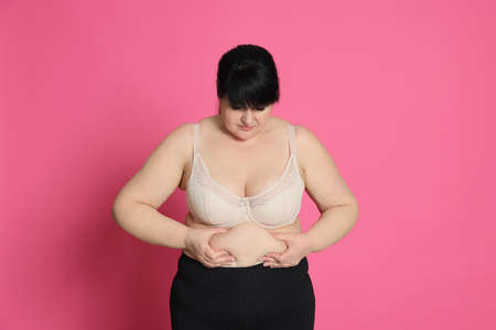 Side view of unrecognizable fat plump woman holding unzipped shorts, showing excess naked abdomen on blue background.