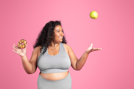 Excited african american overweight lady in sportswear tossing green apple, chooses between donut or fruit