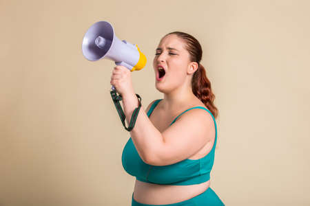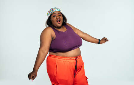 Pretty oversize woman wearing sportswear posing in studio - Beautiful girl accepting body imperfection, beauty shots in studio - Concepts about body acceptance, body positivity and diversity