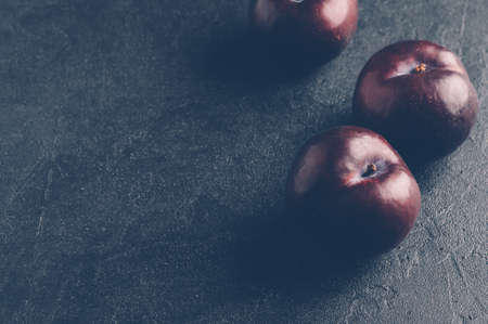 Group of three whole fresh red plum on wooden square plate isolated on black glass