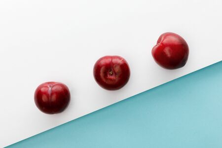 Ugly funny accrete plums on a light background. Flat lay. Copy space.