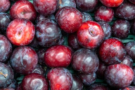 Background of blue plum on sale at the market close up. Blue plum pattern on sale at the market.