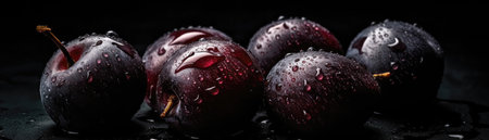 Close-up of fresh, ripe plums glistening with water droplets. Captures the beauty and freshness of these juicy fruits, perfect for showcasing healthy eating and summer flavors.