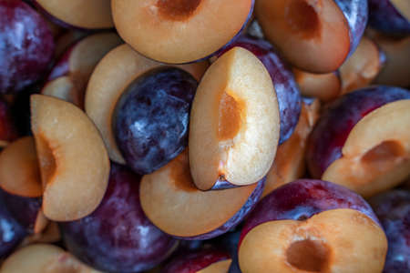 Food background of cutted halfs of blue plums. Top view with selective focus.