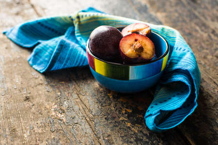 Healthy food concept fresh orgaic plums in a rustic bowl