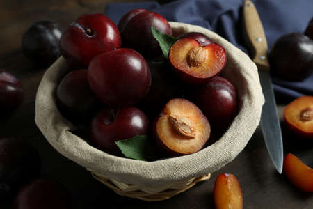 Fresh purple plums in a bowl on the wooden background