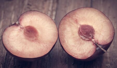 Juicy ripe cut red plum. Vintage wooden background, selective focus