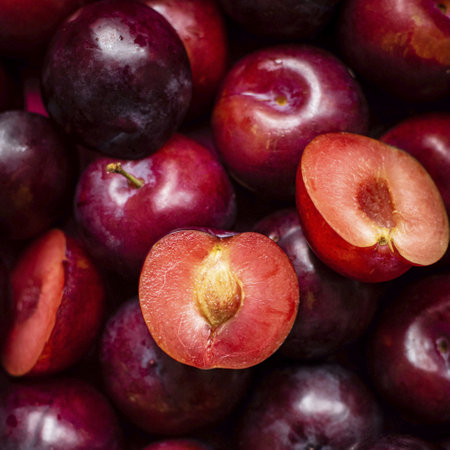 Ripe plums cut in half with pit visible, clean background for text