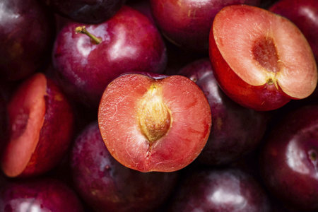 Fresh ripe halved plum showing the golden flesh and stone or pip with a pile of purple plums behind and foreground copyspace.