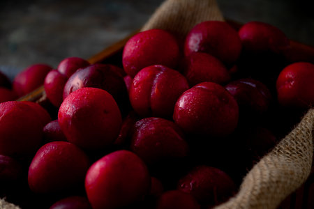 Close up of sweet ripe red plum in box.