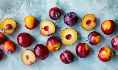 Assorted plums on a light blue surface, sliced and whole