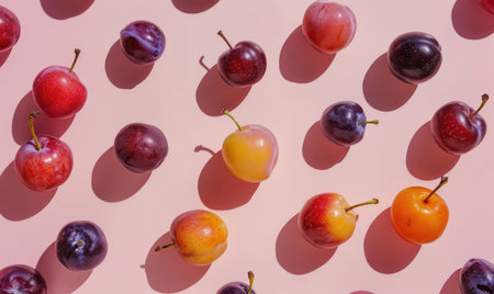 Assorted plums on a light pink surface