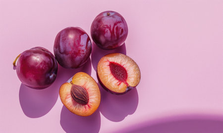 Fresh plums on a light lavender surface, whole and halved, vibrant, juicy, elegant, f/3 --ar 5:3 Job ID: dc153a0a-61f9-4f4a-9d81-a9e36d5f293b