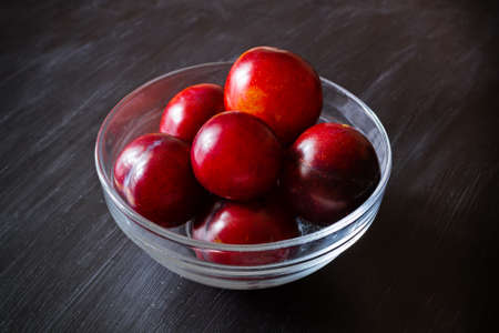 Red ripe plums in transparent glass bowl on dark background, close-up.