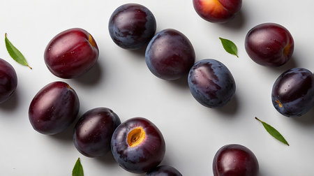 Ripe plums are artistically arranged on a white surface, accented with green leaves, creating a fresh and vibrant food still life perfect for culinary publications.